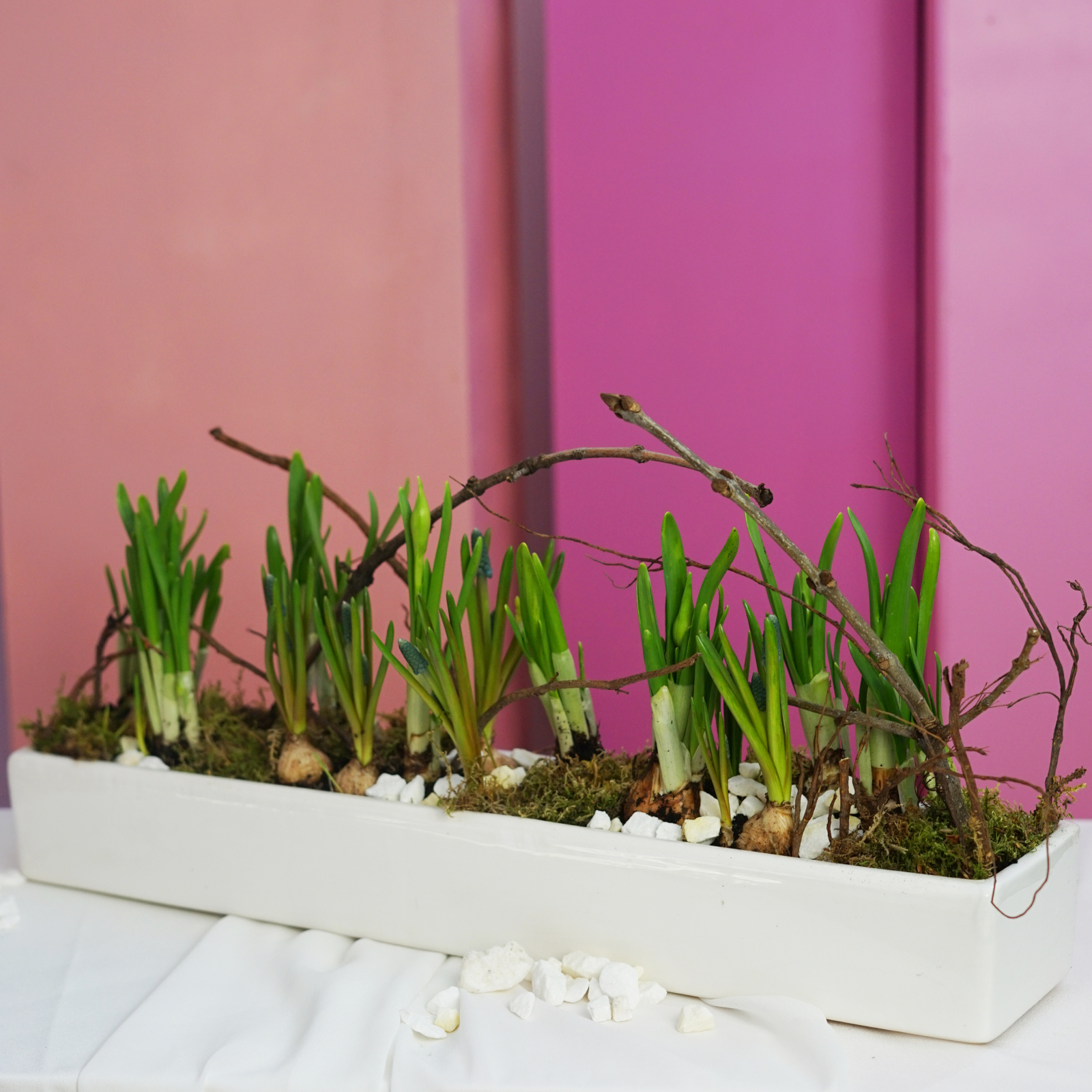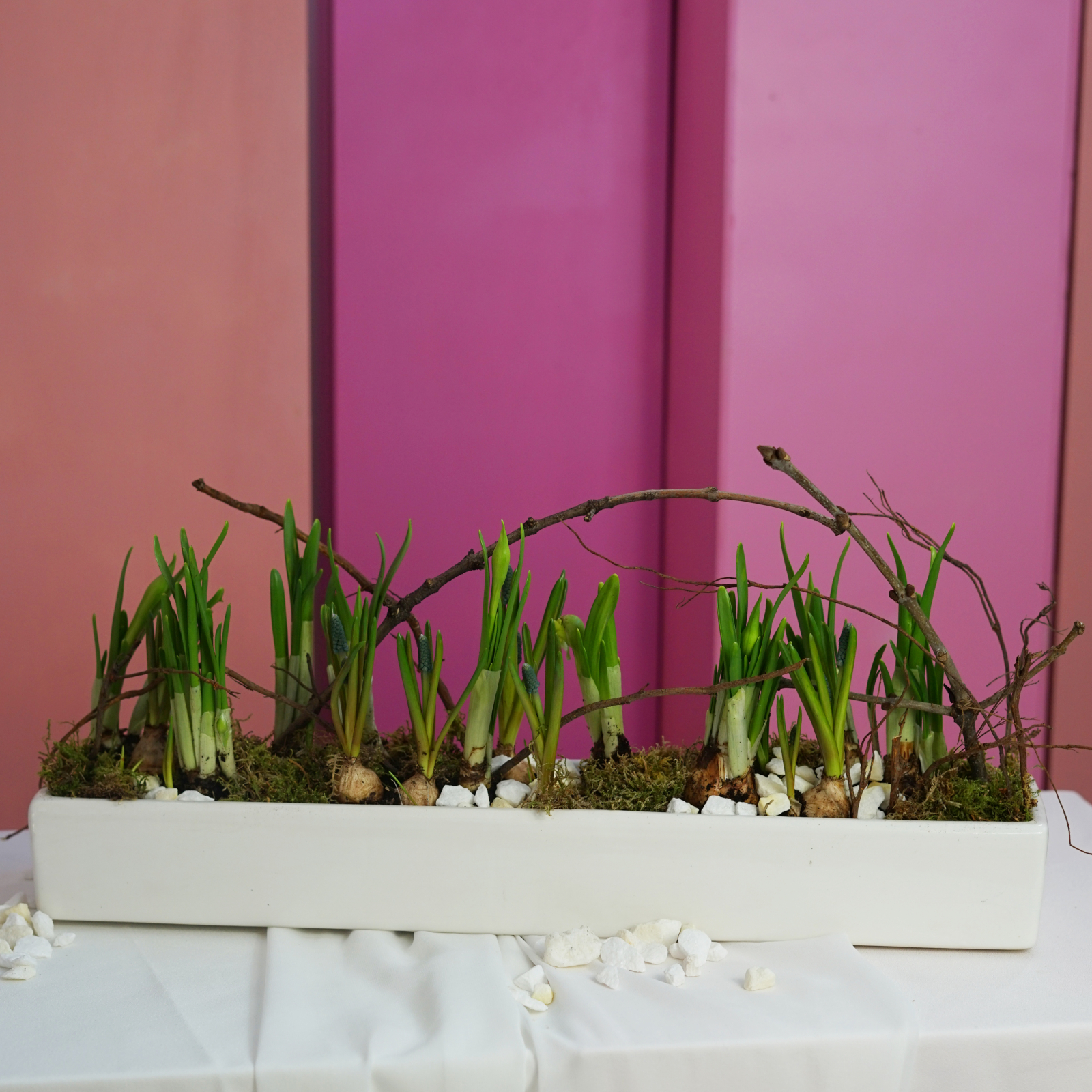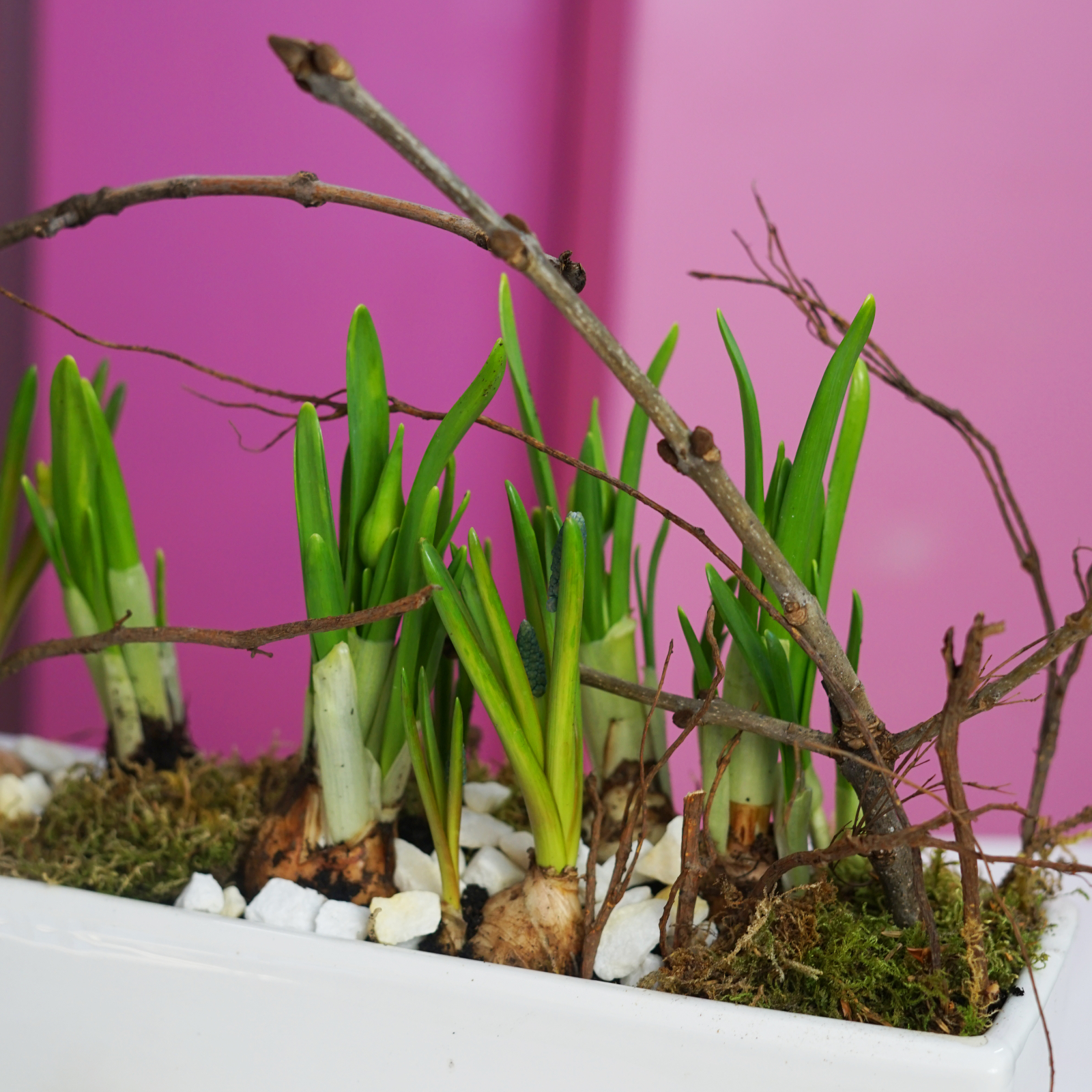 Bulbii sunt in pamant si decorul contine elemente naturale.