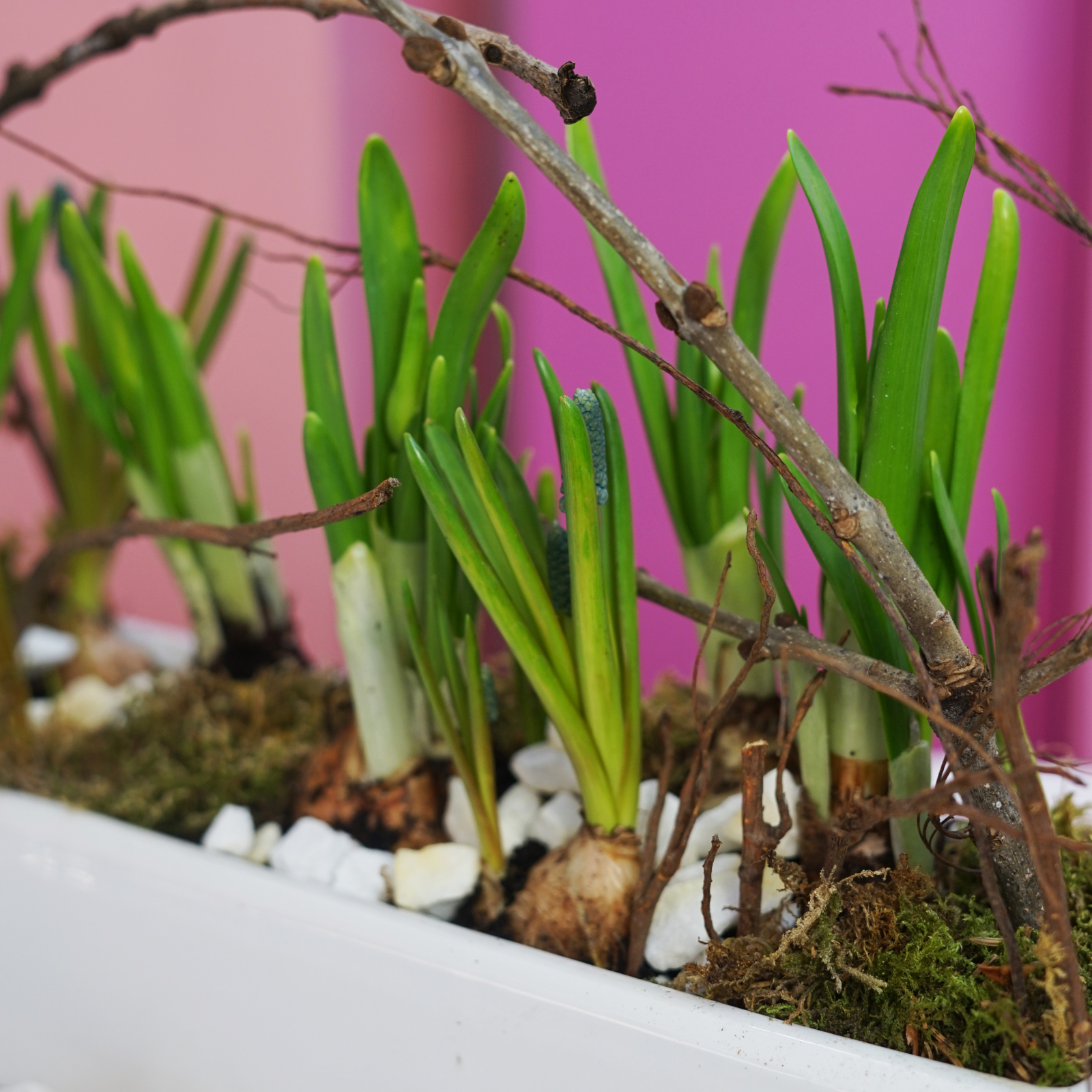 Aranjamentul contine: mix bulbi de narcise si muscari cu elemente naturale de decor