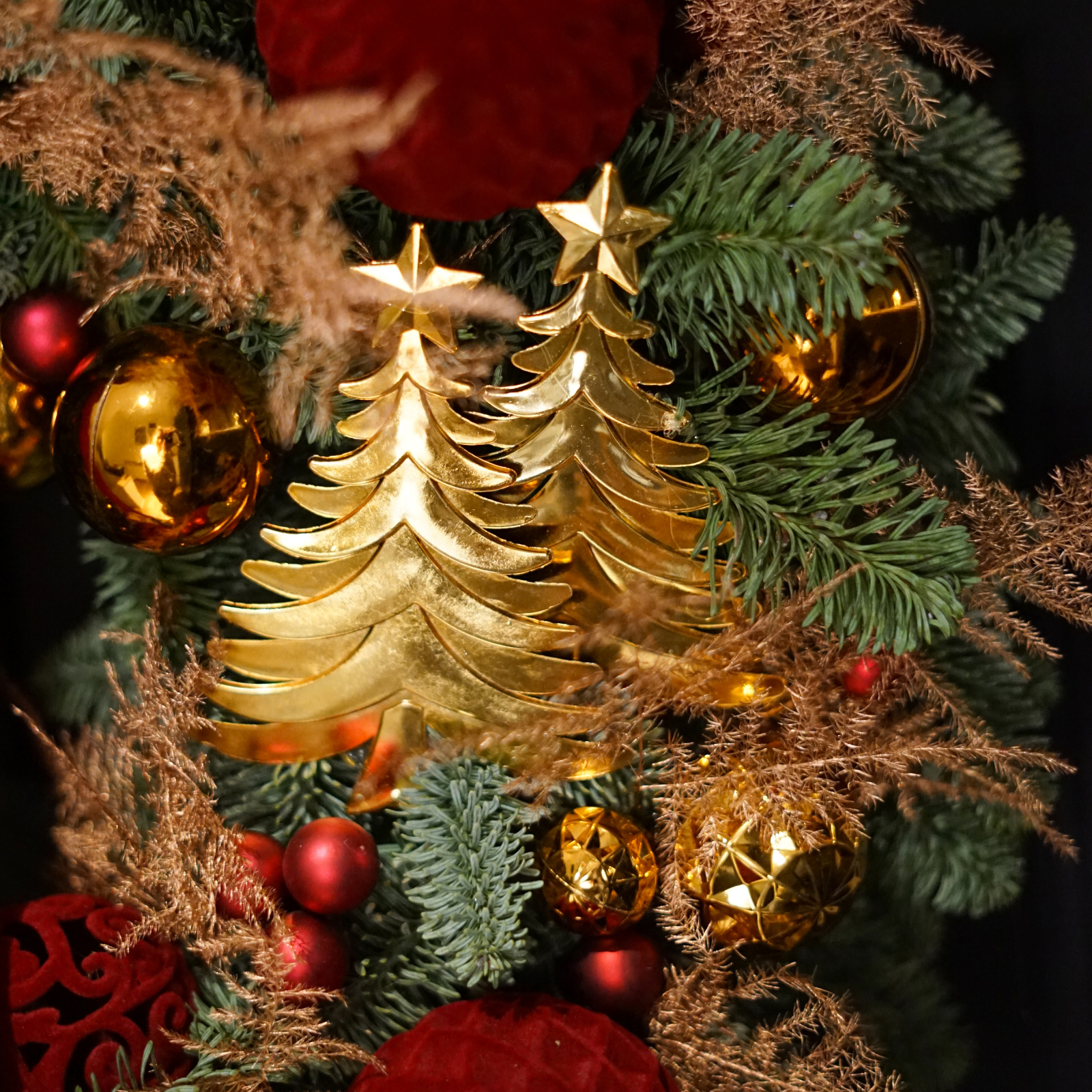 Coronita de Craciun din crengi de brad natural Nobilis, brad ce nu se scutura. Design realizat din globuri lucioase aurii, globuri de catifea si alte accesorii..